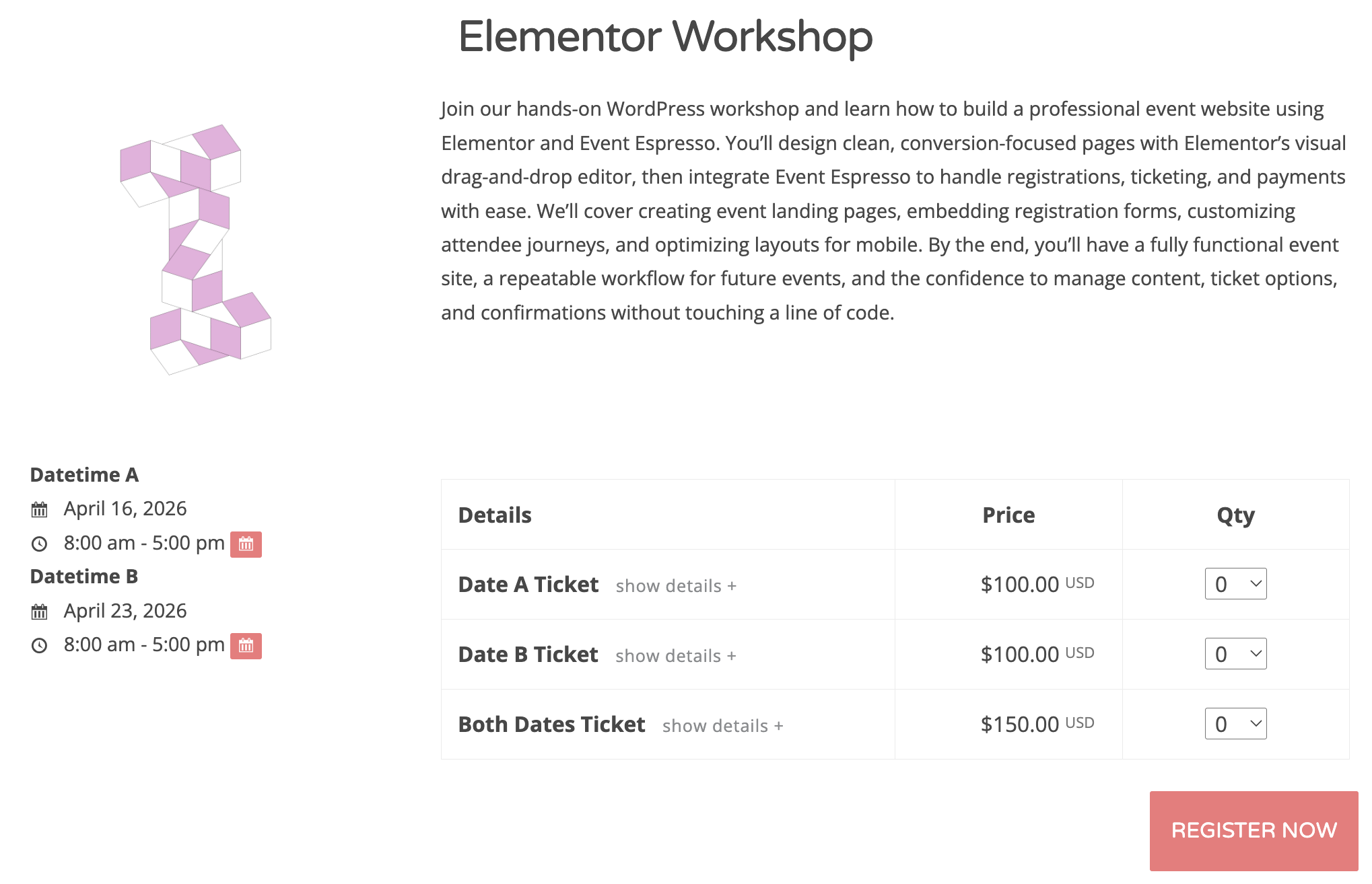 Use Event Espresso content inside Elementor layouts via dedicated widgets (tickets, dates, event content, and venue details). You can use any layout or design you or your clients need. This has multiple dates, multiple ticket options, tickets for each day and a ticket for all days.